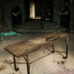 Třetí budovu obcházíme dlouho, než konečně zjistíme, jak dovnitř. Tady je největší šero a největší chlad. Menší stavbu obklopují stromy a tak se sem sluneční paprsky dostávají jen stěží. Tady nacházíme pitevnu – prostornou místnost, kolem dokola obloženou malými kachličkami, jejíž doménou je kdysi bílý pojízdný pitevní stůl s rýhami pro odtok krve. Potrubí, které ji pak svádělo do díry v podlaze, už chybí, ale cákance na zdech, které v šeru připomínají krev, ho v dojmu nahrazují.