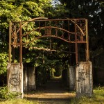 Když konečně vidíme betonové oplocení komplexu, naše srdce poskočí vzrušením. To ale vzápětí střídají obavy. Silnice je tu dost frekventovaná, vstupní bránu, někdo opatřil několika řetězy, zámky i cedulí se zákazem vstupu, a navíc tu stojí restaurace, z níž zrovna provozovatel vynáší stolky na venkovní posezení s výhledem na první stavbu. Chvíli rozvažujeme co dál. Když už jsme dojeli tak daleko, nemůžeme se vzdát. Proto s lehkou drzostí míříme na neoplocenou zahradu restaurace a rychle mizíme v přilehlém lesíku. Naše oprsklost se vyplácí. Brzy nacházíme vyšlapanou cestičku do areálu.